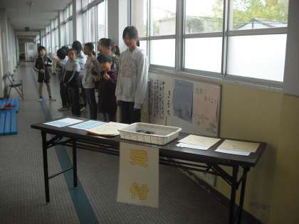 写真は,受付で少し緊張気味に待っている5年生の様子です。それぞれの仕事を頑張ってくれました。