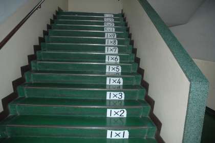 階段に「九九カード」を貼りました。階段を上る度に九九を唱えます。まずは,1の段と5の段から始めます。