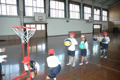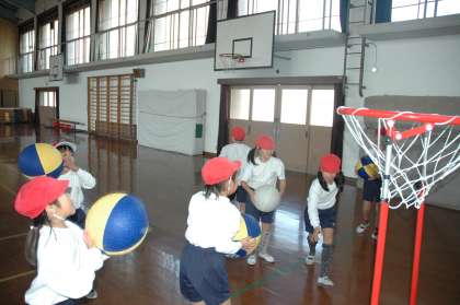 体育の学習は「パスゲーム」です。まずは,ボールをゴールに入れる練習をしました。どれくらい離れたところからシュートを決めることができるかやってみました。意外と入らないので,何度も練習しました。
