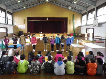 今日は体育館で「どんぐりフェスティバル」がありました。始まる前は,みんな「ドキドキする」と言っていましたが,お店の紹介をしっかりいうことができました。