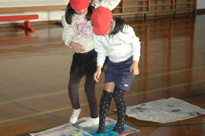 ワンツーの時間に「ワニ池渡りゲーム」をしました。二人で新聞紙から落ちないように協力しながら進みます。3人,4人と増やすほど協力することの大切さが分かってきました。