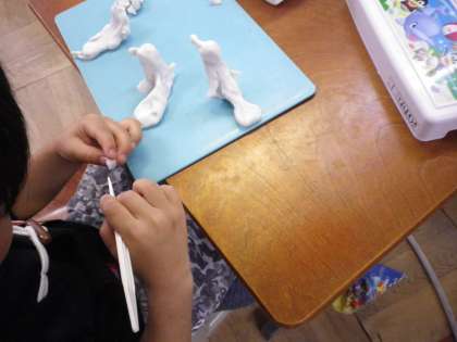 今日は「どうぶつさんだいすき」でねんどを使いました。ねんどべらを使って仕上げていきました。