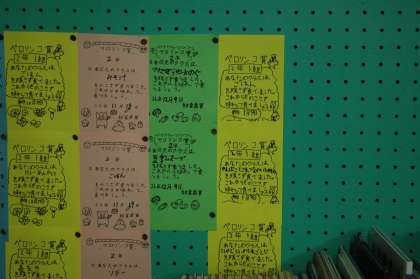 ペロリンコ賞を3枚いただきました。高野豆腐の卵とじ,蒲鉾と小松菜の炒め物,そしていつもの,ごはん,の3枚です。用意した掲示板に貼り切れなくなってきました。