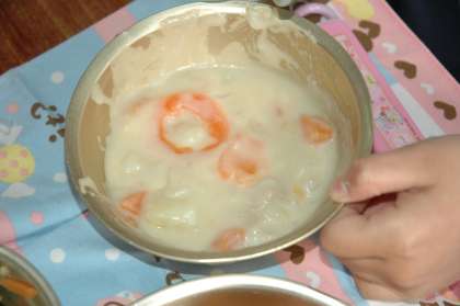 給食の「豆乳のクリームシチュー」に,幸せニンジンが入っていました。ニンジンが入っていると,何の形をした幸せニンジンなのか楽しみにしています。