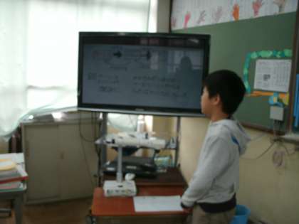 2人組で相談しあったり,ノートを電子黒板に写して友達に説明したりしながら学習を進めています。子どもたちは,友達の意見を興味深く聞いています。