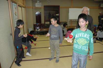 剣玉をしました。剣玉は難しかったようですが,ちょっとしたヒントをもらってできるようになっていました。偶然でもできた時は喜んでいました。このほかに,ヨーヨーやコマ回しもしました。