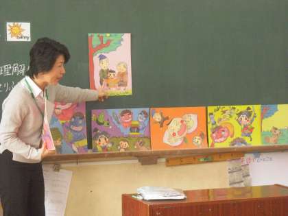 桃太郎の話を英語で聞き,話の順を追って紙芝居を並べていきました。グループで役割を分担してセリフを言うときは,大きな声が出せている班もありました。