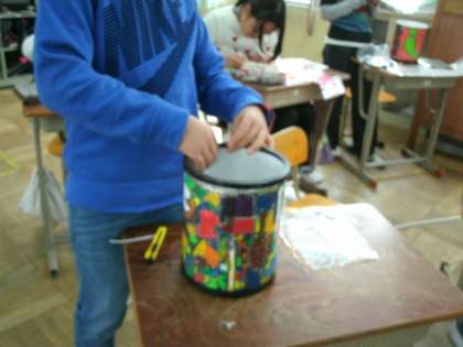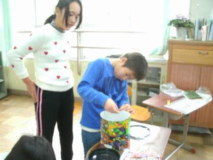 スタンドボックスが完成してきました。筒の形にするのに,こつがいります。協力しながら進めています。