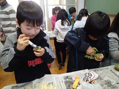 キウイは真ん中の白いところが甘くておいしいことを教えてもらいました。スプーンですくって食べるとその甘さに驚きました。帰りには,八朔とキウイのお土産をもらって帰りました。