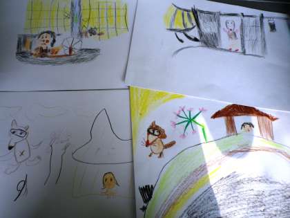 たぬきの糸車の紙芝居を発表しました。発表の後はいいところを伝え合いました。