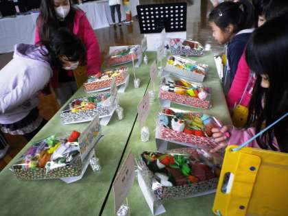 造形展の鑑賞に行きました。1年生の作品を他学年のお友だちがじっくりみてくれていました。1年生も,じっくり鑑賞しました。