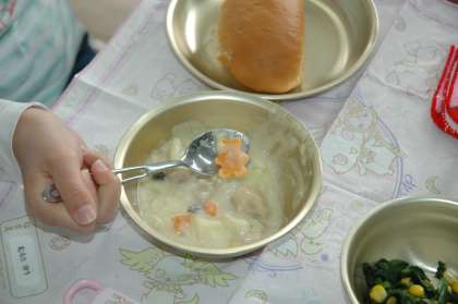 給食の「きのこのクリームシチュー」に幸せニンジンが入っていました。この日は,クマの形でした。幸せニンジンが入っているとカードがもらえます。たくさんたまりました。