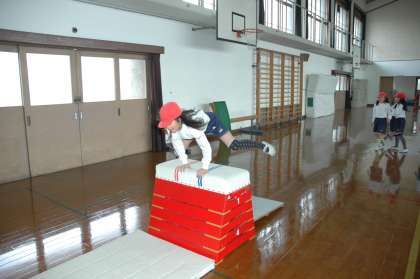 体育の時間に跳び箱運動を練習しています。2年生も跳び箱の段を増やして挑戦しています。跳べたときは笑顔で着地しています。