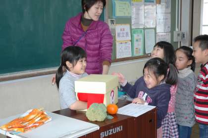 内輪先生と「食の学習」をしました。箱の中の食べ物を手探りで考えました。中から出てきた,ブロッコリーや椎茸なども大切な野菜だと教えてもらいました。