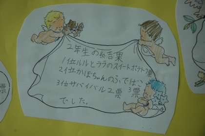 図書委員会の学年別「好きな本」アンケートの結果が出ました。2年生は,「ルルとララのスィートポテト」「かぼちゃんのふでばこ」「サバイバル」が上位に選ばれました。これからもたくさん読書をしましょう。