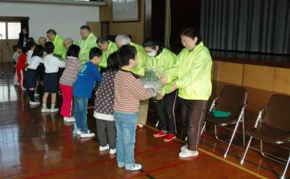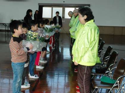 1年間毎日温かく見守っていただいたパトロール隊の方へ感謝の気持ちを込めて1年生はお花を渡しました。「あくしゅもしたよ」とうれしそうでした。
