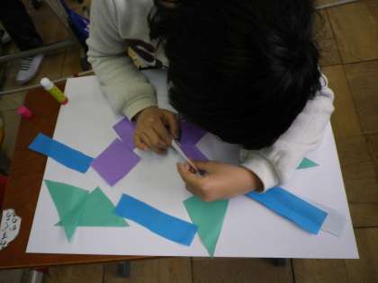 復習をしています。今日はかたちの復習で,折り紙を切ってかたちづくりをしました。