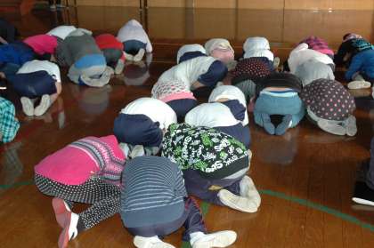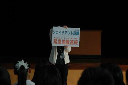 児童朝会の後にシェイクアウト訓練について学びました。いざという時に,どうすればいいかを学びました。訓練は10時25分から行います。