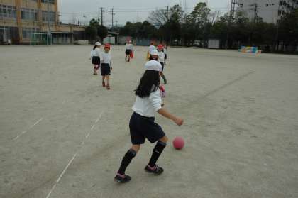 運動場に影がくっきりするような陽射しはありませんが,暖かい日でした。そんな中でサッカーをしました。何も言わなくても上着は脱いでいました。動きも寒かった時期に比べて良くなっています。ゴールもたくさん決まりました。