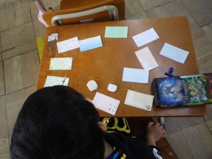 いいこといっぱい1年生の学習のまとめとして,お友だちにメッセージカードを書きました。友だちのいいところや頑張っていたこと,すごいなと思ったこと,感謝したいことなどを書きました。13種類のカードから友だちが喜んでくれそうなカードを選んで書いています。