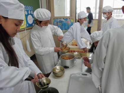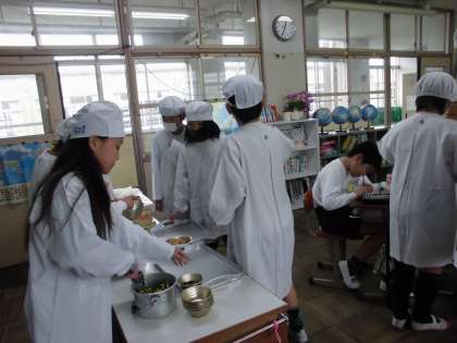 久しぶりの給食当番です。給食のエプロンも1年を通して着るマイエプロンです。まだ大き目のエプロンですが,そのうちにピッタリになるかもしれません。
