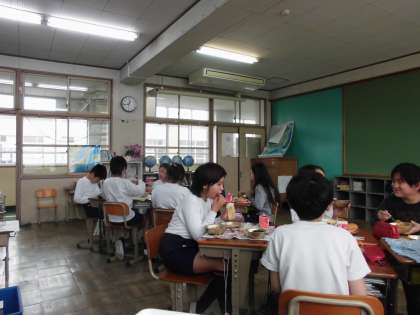 12人で4班なので,給食のときは6人グループで食べています。にぎやかで楽しそうな給食です。時間内に全員食べられました。