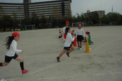 100m走も50m走もゴールを走りぬけるように力強く走るとタイムが伸びます。ゴールを走りぬけないとリレーの時のバトンがうまくいきませんので。