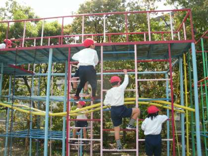 久しぶりのお天気で,今年初めて外で体育ができました。総合遊具でたっぷりと遊びました。遊具で遊ぶときは親指を使ってしっかり遊具を握ること,(手・足・足)か(手・手・足)の三か所で体を支えることを確認しました。