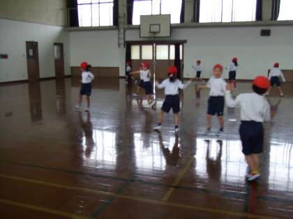 広い体育館での体育。この日は体ほぐしの運動。いろいろな進み方で壁にタッチして返ってきます。走る・スキップ・横ステップなどなど楽しんで運動していました。