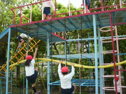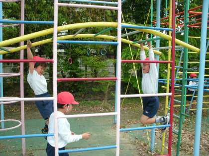今日も天気がよく,外で遊ぶことができました。鎖を上ったり,雲梯をしたり,棒の滑り台をすべったり,色々な遊び方に挑戦して楽しみました。