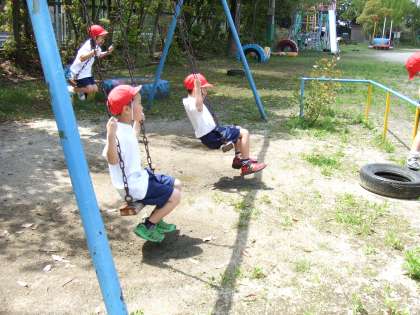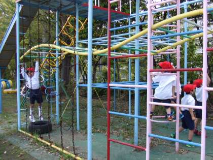 いろいろな遊具の安全な遊び方を学習しています。大きな総合遊具にみんな大興奮です。