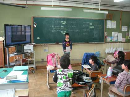 帰りの会で,デジカメを使って「今日のニュース」を紹介しています。「いつ」「どこで」撮ったかをみんなに伝えています。
