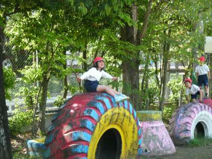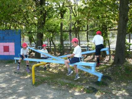 今週はお天気続きです。シーソーやタイヤなどの遊具で遊びました。