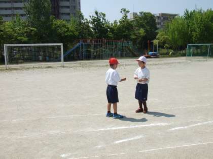 今日は2年生と体育をしました。50メートル走をしました。まっすぐ自分のコースを走るのを頑張りました。そのあとは一緒にドンジャンケンをしました。楽しみました。