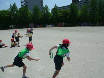 1年生と一緒に体育の時間にリレーあそびをしました。2年生はチームのリーダーとして,走り方のアドバイスなどをしていました。