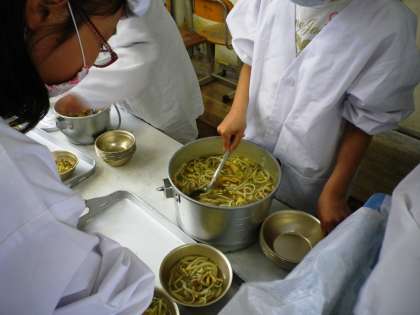食缶いっぱいのカレーうどんをみんなで食べたらお腹いっぱいになりました。熱々で美味しかったです。