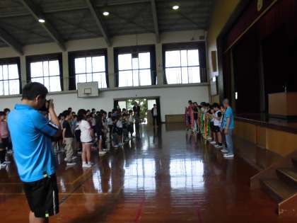 いってらっしゃい!6年生。たくさんの鶴をていねいにつなげて広島へ届けてくれます。どうか私たちの平和への願いを持って行ってください。