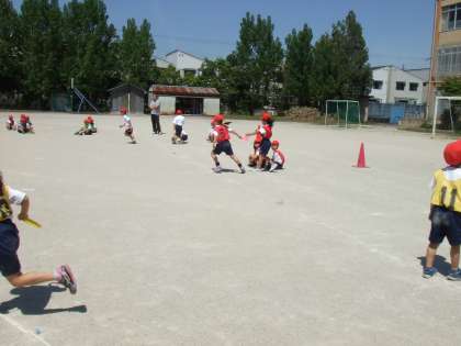 2年生といっしょにリレーあそびの学習をしています。早く走るにはどんな工夫が必要か,みんなで考えました。