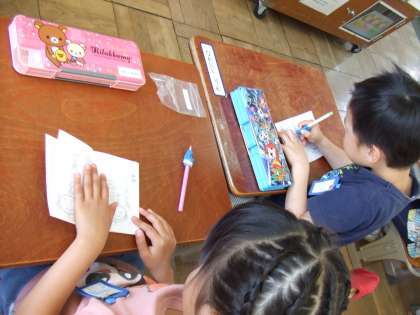 栄養教諭の先生がまほうの食べ方について教えてくださいました。全部食べられるように自分の呪文を考えました。