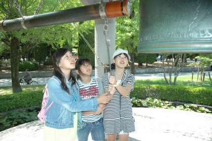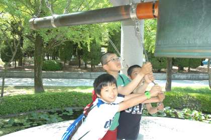平和の鐘を突きました。鐘をよく見ると世界地図が描かれていました。しかし,国境は描かれていません。そのことに気づいて鳴らしていました。