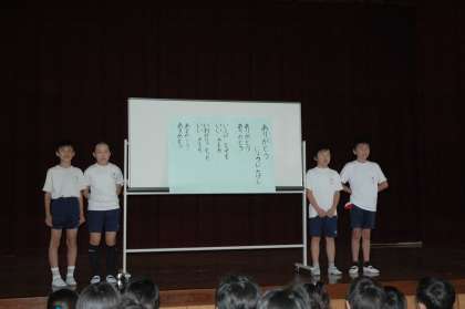 集会委員会による,群読集会をしました。しょうじたけしさんの「ありがとう」を元気に読みました。
