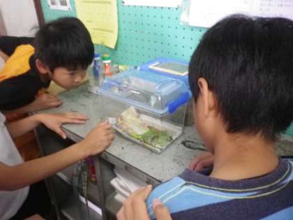 教室にアゲハチョウの幼虫がいます。2匹は,さなぎになりました。
