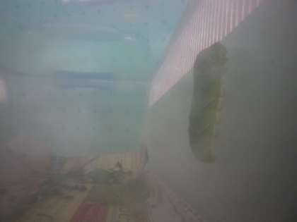 アゲハチョウの幼虫の1匹が,さなぎになり始めました。