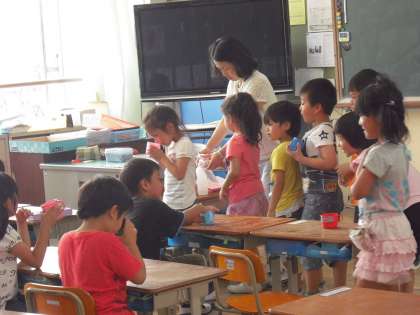 担任の先生の合図に合わせて,上手にブクブクうがいができました。