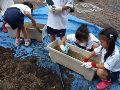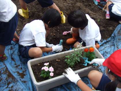 今日は,花育活動でプランターに花を植えました。同じグループの人と協力して優しく花を植えました。