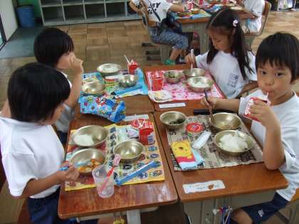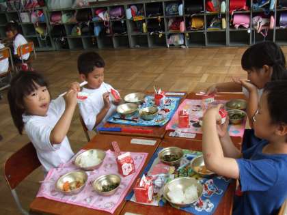 今日の給食は,高野豆腐と野菜の炊き合わせ,ほうれん草ともやしのごま煮,りんごゼリーでした。はじめの頃に比べてはやく食べられる人が少しずつ増えてきました。