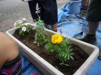 雨がやんだ6時間目に花育活動をしました。しっかり水やりをしていきましょう。