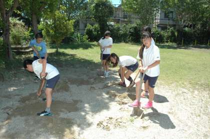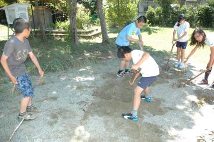 運動場の砂場を整備しました。草を取って,砂を柔らかくしました。体育で走り幅跳びをする準備ができました。