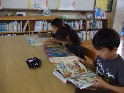 今日の朝読書は2年生といっしょに図書室の日でした。選んだ本を静かに読んでいます。