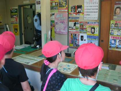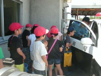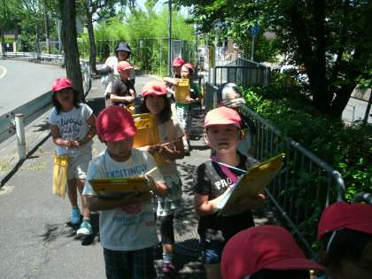 生活科で校区探検に行きました。桜並木の下を歩き,消防署や向島病院の方へ行きました。向島交番では交番の中なども見学させてもらいました。